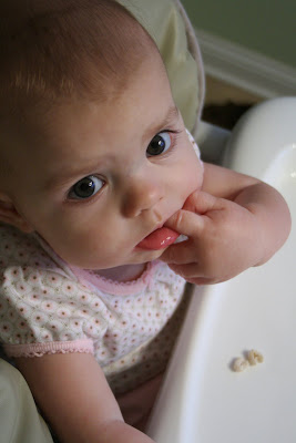 Anyway, it took her some time to figure out that when Mom and Dad are not going to shovel food in the mouth, maybe the thumb and index finger do the trick and make quick work of those puffed morsels.